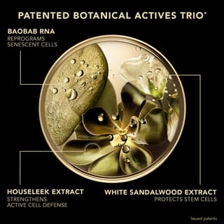 W sercu formuły znajduje się trio cennych składników roślinnych – ekstrakt z białego sandałowca, ekstrakt z rojnika, RNA z baobabu – które reaktywują białka odpowiedzialne za długowieczność komórek***, korygując wszystkie oznaki starzenia. W połączeniu z niacynamidem, składnikiem dermatologicznym, dla wzmocnienia skuteczności, oraz papainą, która wygładza strukturę skóry i poprawia jej blask.
