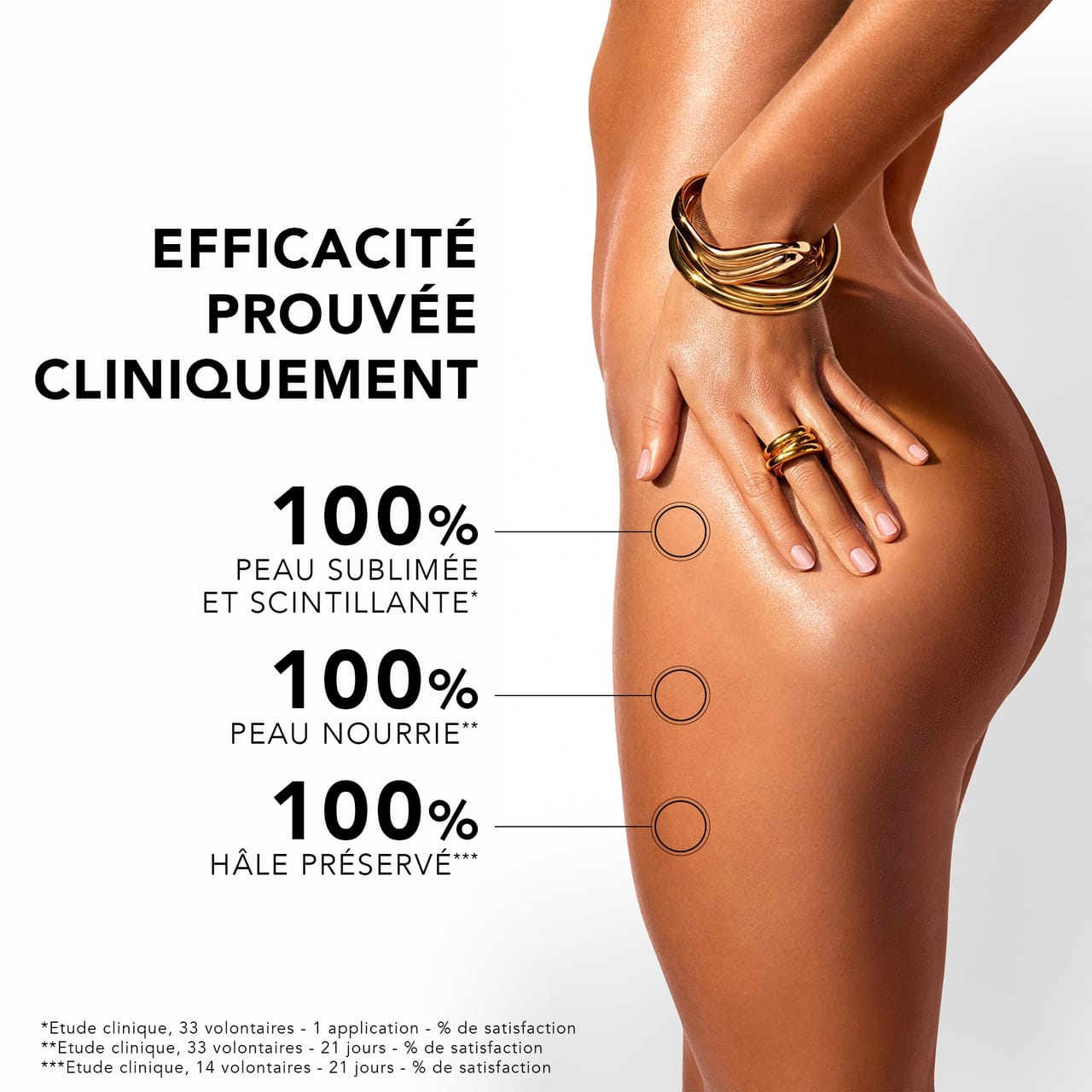 Brokatowy olejek wzbogacony 4 cennymi olejami roślinnymi, który sublimuje i odkrywa blask w jednym geście. Pozostawia na skórze perłowy welon z refleksami 3 odcieni złota.